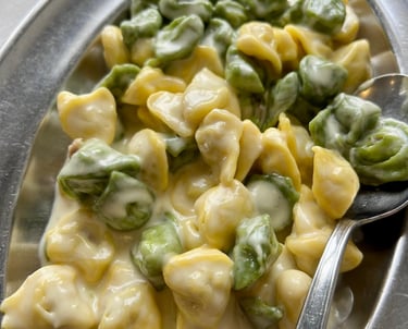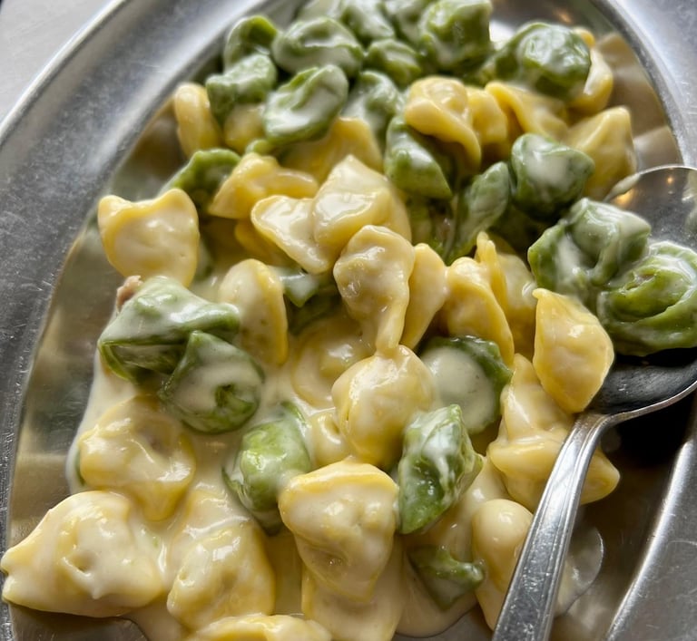 One highlight of the menu is the tagliatelle made with nettle-infused dough, a vibrant and earthy twist on the classic pasta that showcases the kitchen's creativity and deep connection to local ingredients. Another great dish is the tortellini gialli e verdi, crafted from traditional egg dough and nettle-infused green sfoglia. Served with a delicate cream sauce, these tortellini capture the balance between tradition and creativity that defines Ca’ Guidotti.